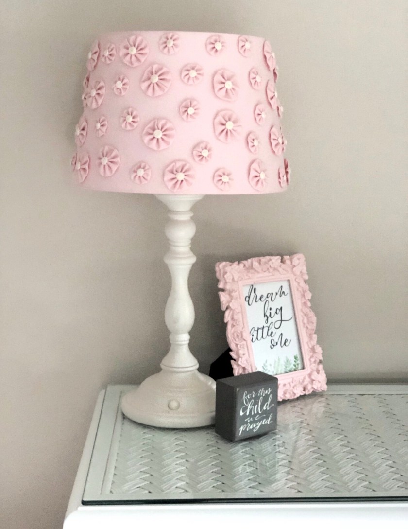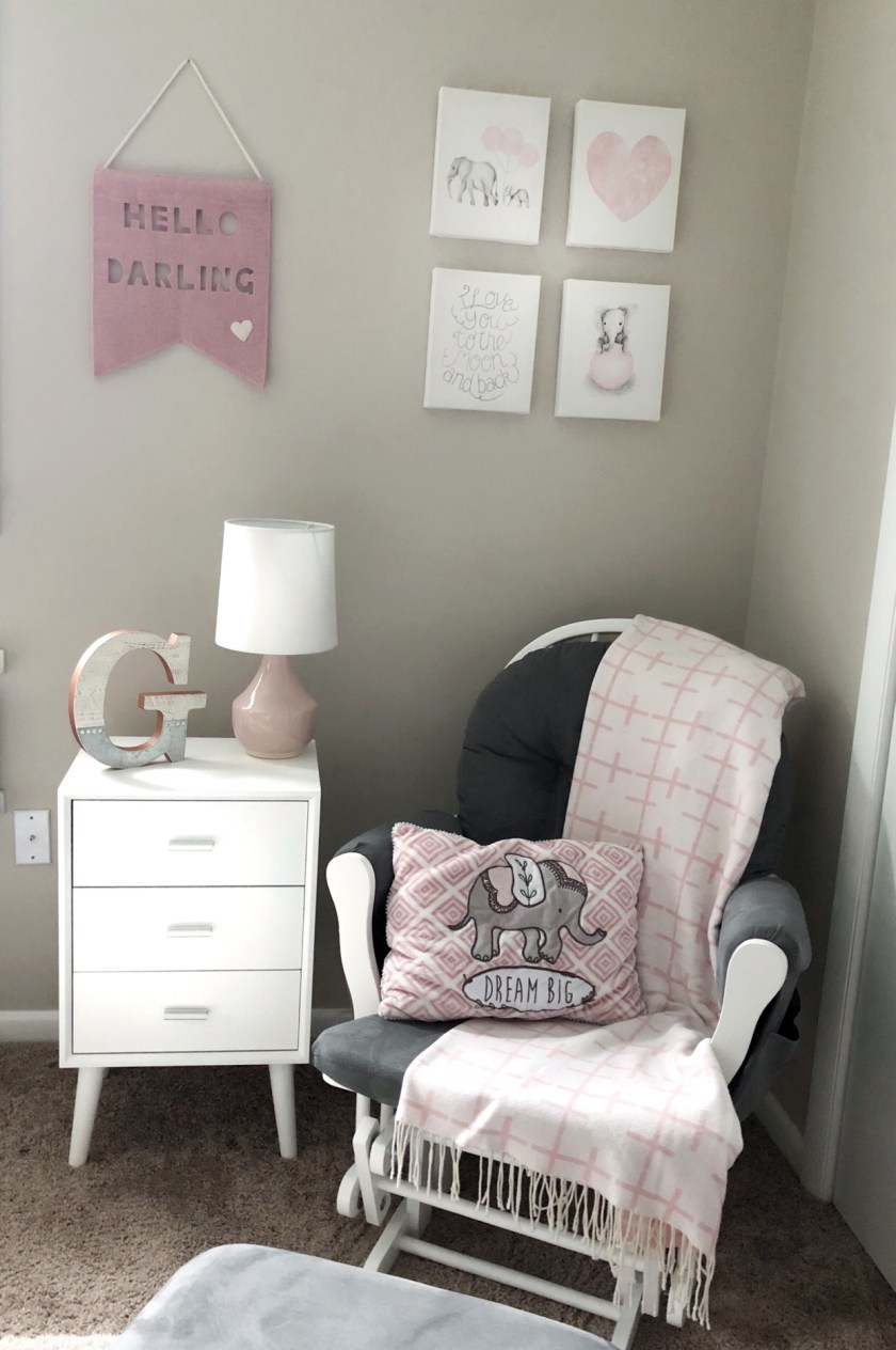 When found out we were having a girl, I was so excited to decorate the nursery! I knew I wanted it to be pink and grey, with white furniture. The interesting thing about Gracie’s nursery now is that most of the large items (furniture, lighting, chair) were purchased for her bedroom in our first house – which was much smaller and had a sloped ceiling.