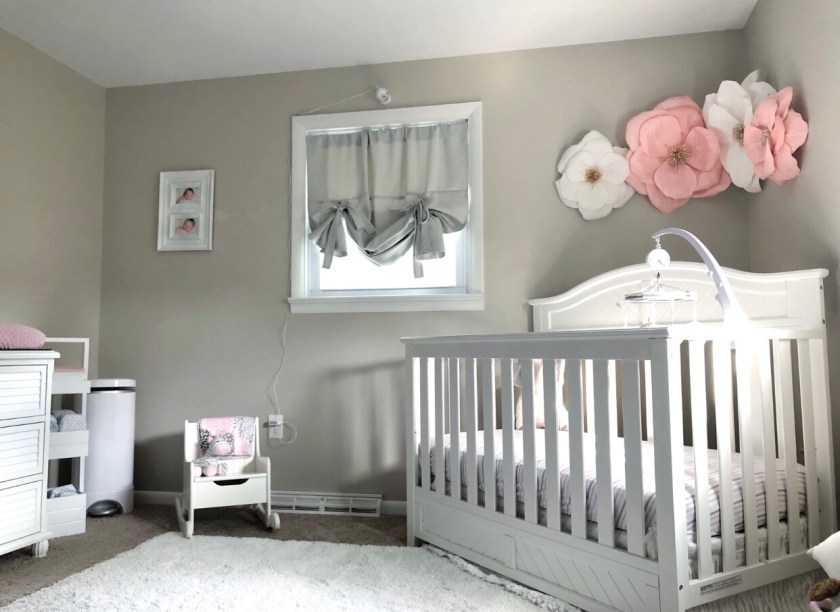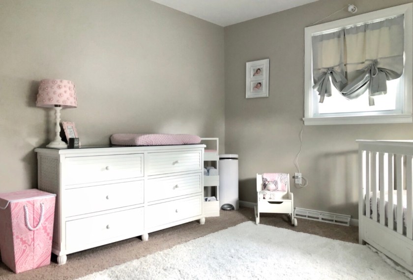 We moved when Grace was 3 months old (wouldn’t recommend it), and our entire home was painted the same griege color. Depending on the lighting, sometimes it throws grey, sometimes it throws beige. I was way too tired after the move to think about painting it grey like her first nursery, so we’ve made it work!
